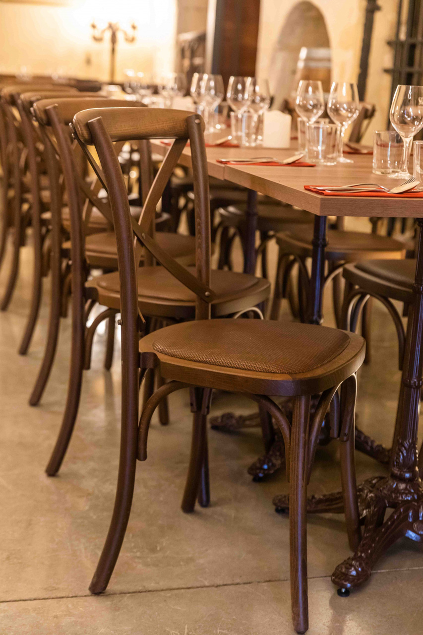 Chaises, tables, fauteuils et éléments personnalisés ont été pensés pour s'intégrer harmonieusement à l'identité du lieu, tout en garantissant une utilisation intensive adaptée aux professionnels.