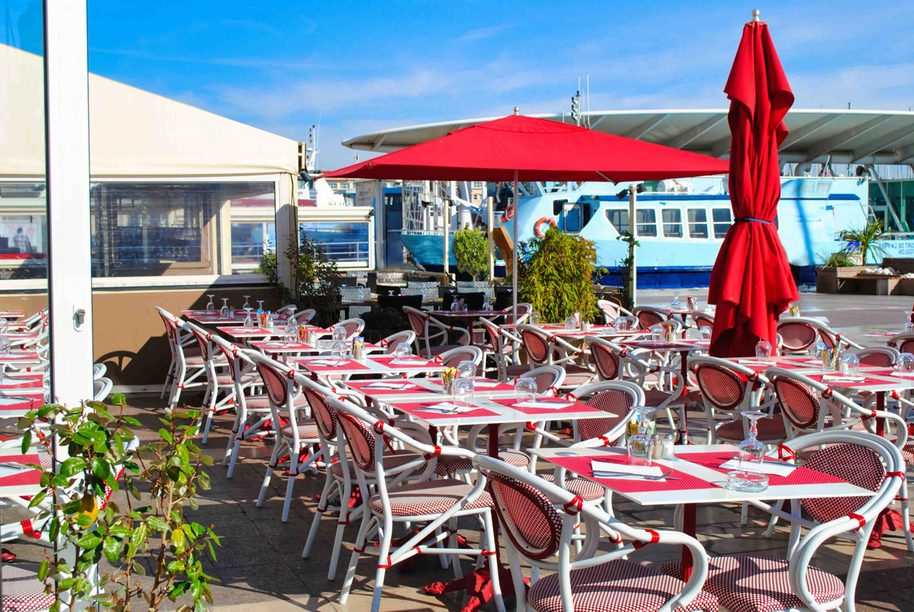 MOBILIER COULOMB a accompagné ce restaurant le Gand café de la Rade, situé à Toulon dans l'aménagement de ses espaces intérieurs et extérieurs.
