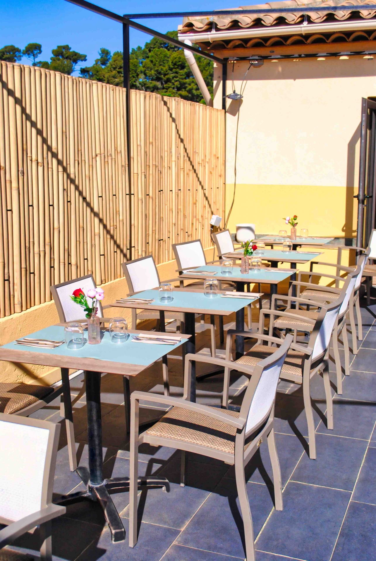 MOBILIER COULOMB a accompagné ce restaurant la Boussole, situé à Ollioules dans l'aménagement de ses espaces intérieurs et extérieurs.