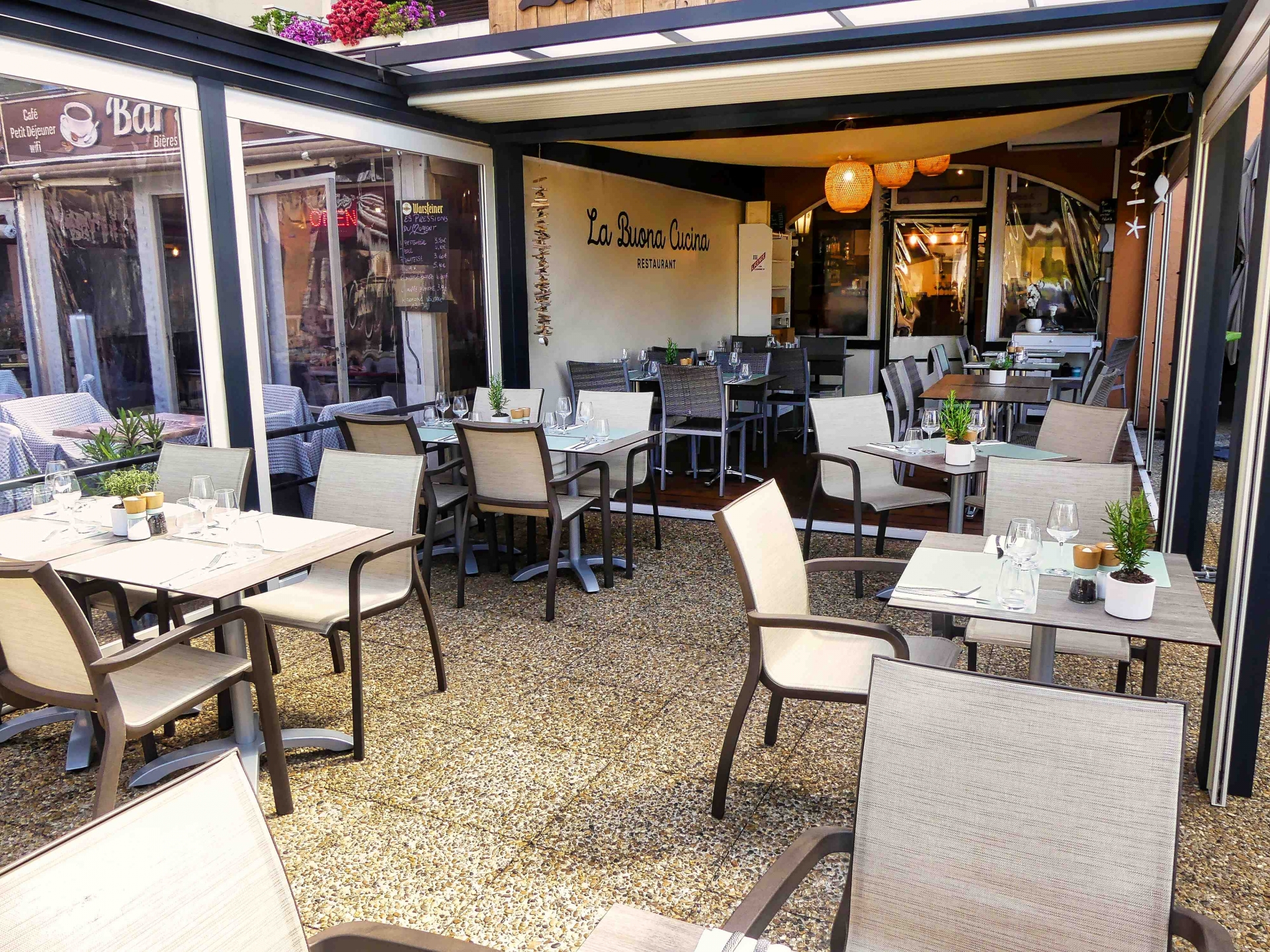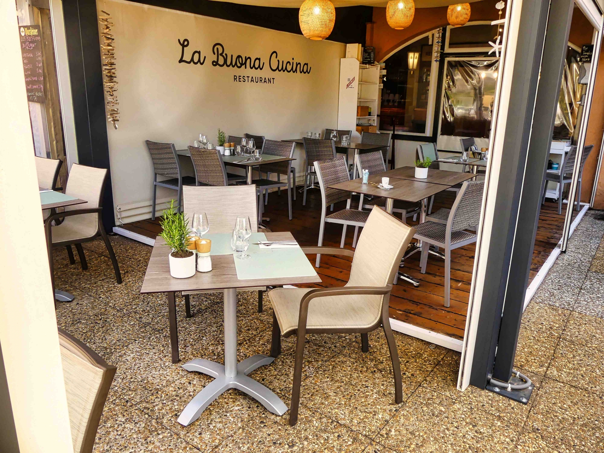 MOBILIER COULOMB a accompagné ce restaurant la Buona Cucina, situé à la Coix-Valmer dans l'aménagement de ses espaces intérieurs et extérieurs.