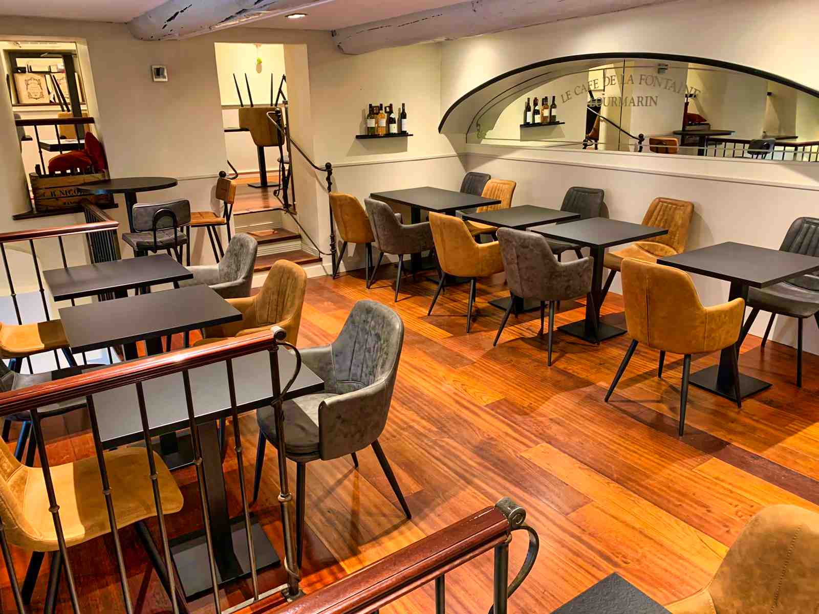 Chaises, tables, fauteuils et éléments personnalisés ont été pensés pour s'intégrer harmonieusement à l'identité du lieu, tout en garantissant une utilisation intensive adaptée aux professionnels.