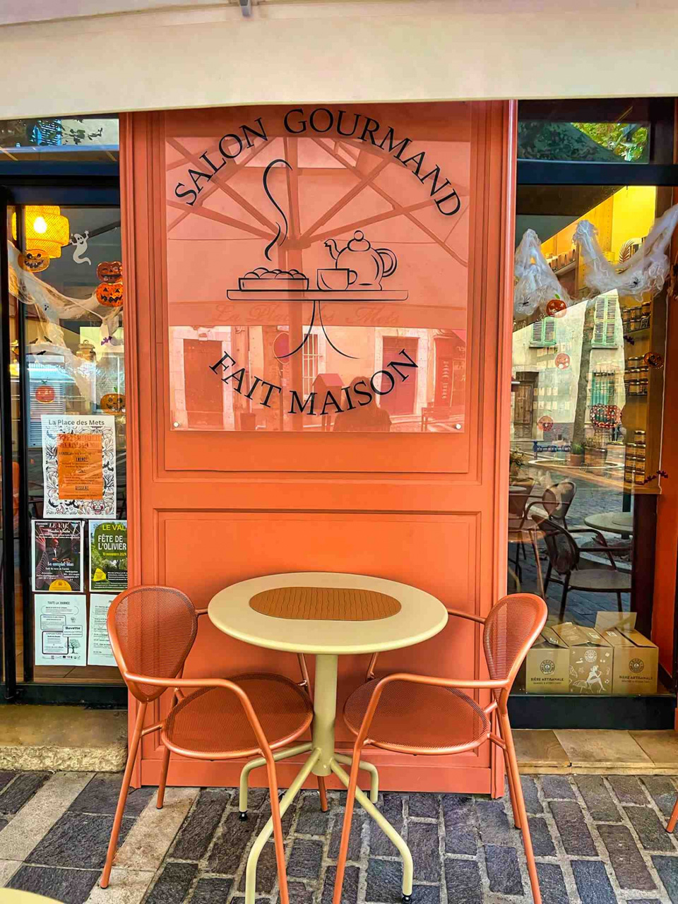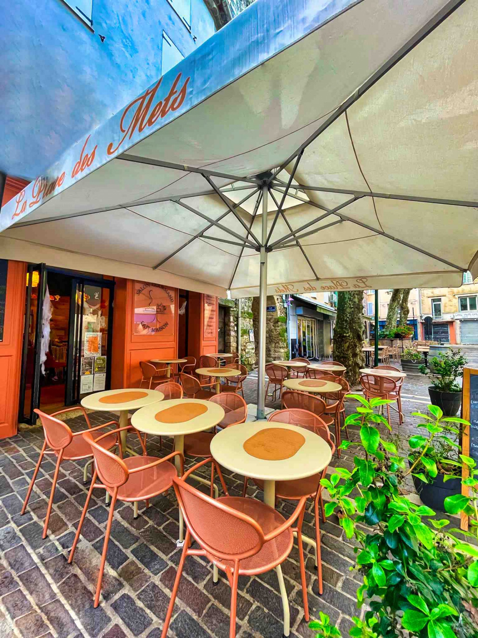 MOBILIER COULOMB a accompagné ce restaurant La Place des Mets, situé au Val dans l'aménagement de ses espaces intérieurs et extérieurs.