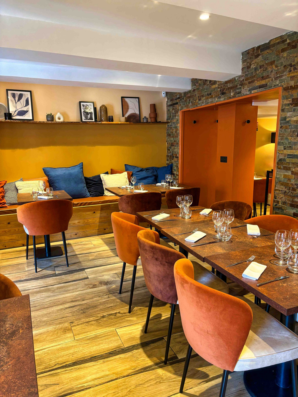 Chaises, tables, fauteuils et éléments personnalisés ont été pensés pour s'intégrer harmonieusement à l'identité du lieu, tout en garantissant une utilisation intensive adaptée aux professionnels.