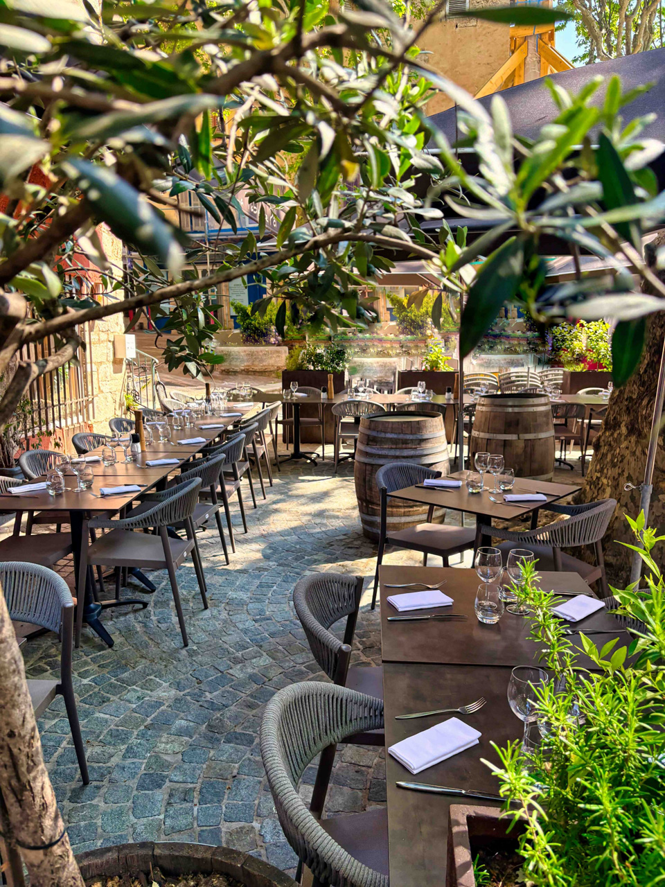 MOBILIER COULOMB a accompagné ce restaurant La Table de Pôl, situé à Lorgues dans l'aménagement de ses espaces intérieurs et extérieurs.
