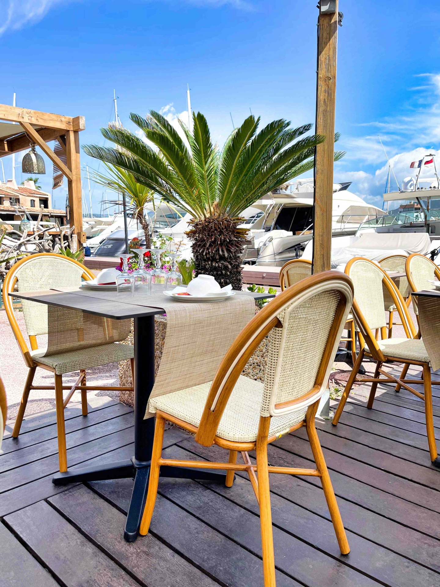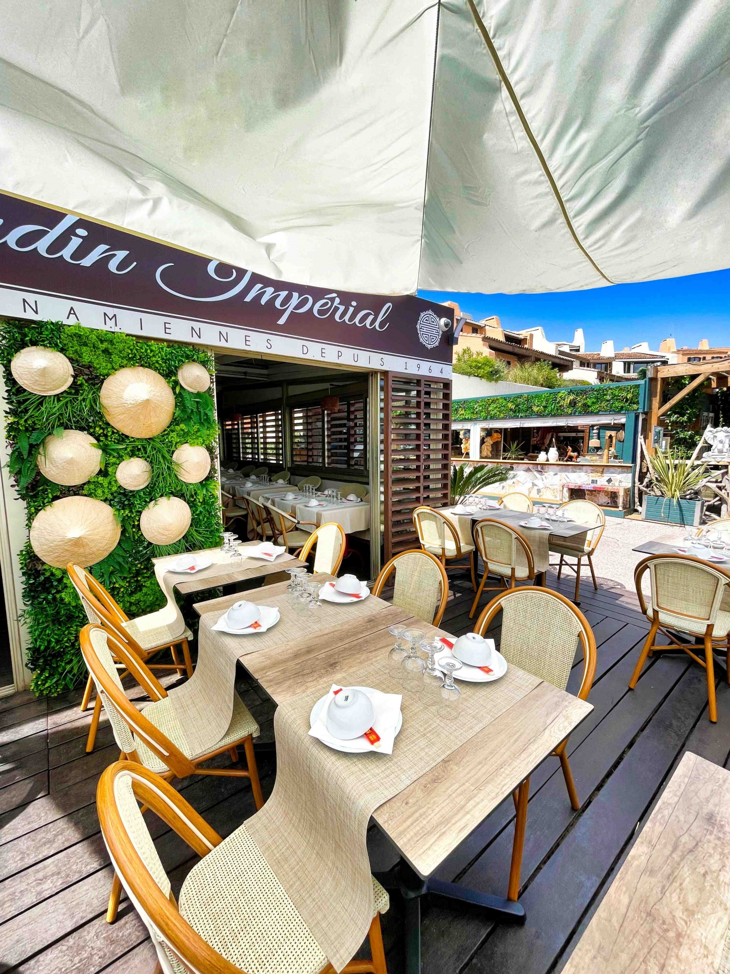 MOBILIER COULOMB a accompagné ce restaurant le Jardin Impérial, situé à Cogolin dans l'aménagement de ses espaces intérieurs et extérieurs.